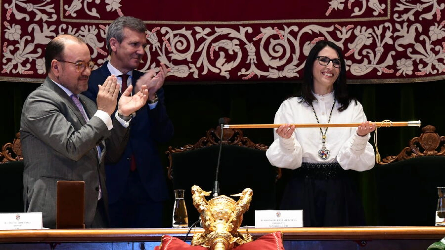 El antiguo rector, Antonio López, ha sido el encargado de entregar la medalla y el bastón de mando a su sucesora. López ha destacado la importancia histórica del momento, al ser Crujeiras la primera mujer en asumir el cargo en la historia de las universidades gallegas.