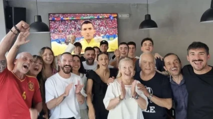 Ambiente en el café Vivian en los partidos de España y al fondo la imagen en televisión del central