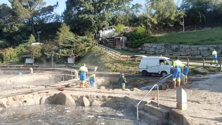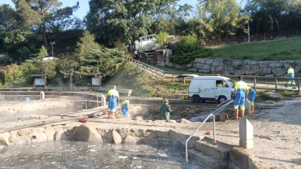 Los operarios trabajan en esta poza termal de la ciudad
