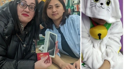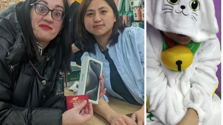 Silvia con la dependienta que le entrega el Iphone tras comprar este disfraz