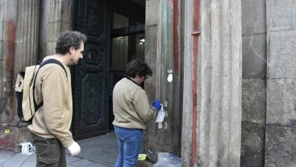 Técnicos en restauración prueban los productos que se utilizarán en la limpieza de la fachada
