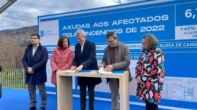 El presidente del Gobierno gallego, Alfonso Rueda, se desplazó este martes a Carballeda de Valdeorras donde firmó un protocolo general con el presidente del Clúster, Víctor Cobo, en el que se recogen las líneas de actuación e incentivos con los que podrán contar los damnificados por los incendios del pasado verano en las comarcas y municipios productores de pizarra.