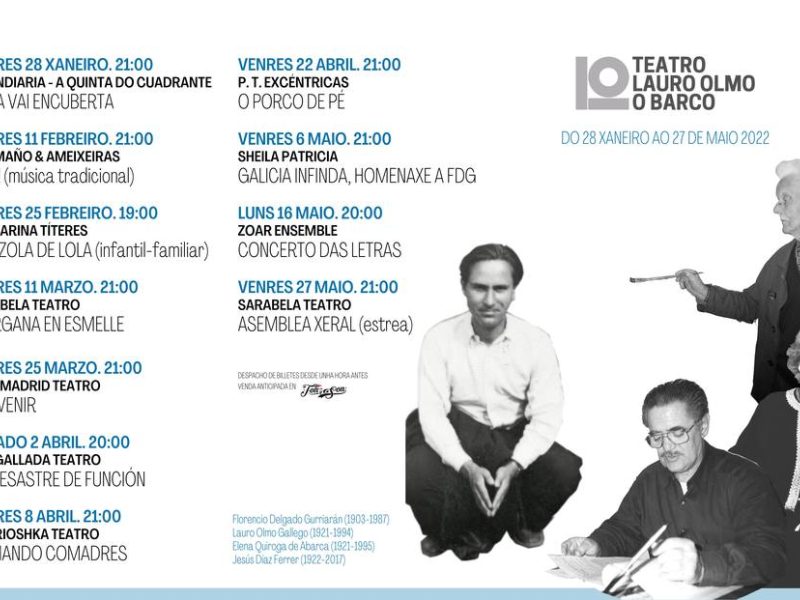 En el Teatro Lauro Olmo de O Barco comienza el viernes, 28 de enero, el programa de actividades de 2022 en el que se va a rendir homenaje a los valdeorreses Florencio Delgado Gurriarán, Lauro Olmo, Elena Quiroga da Barca y Jesús Díaz Ferrer, figuras de las letras que este año, o el pasado, han cumplido el centenario de su nacimiento.