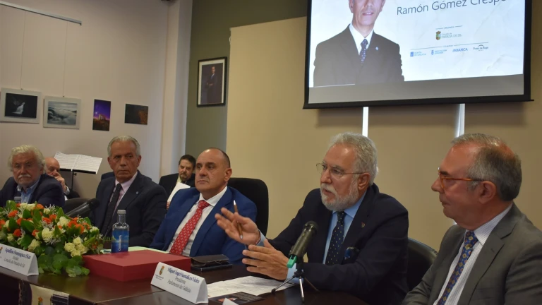 El presidente del Parlamento de Galicia, Miguel Santalices, interviene en el acto de homenaje a Ramón Gómez Crespo
