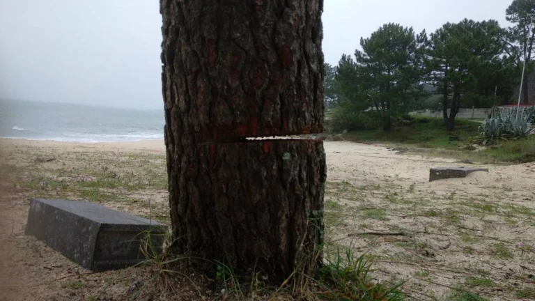 “A foto de onte é clarísima. Vemos que alguén cunha serra secciona tres cuartas partes dun piñeiro bastante grande aproveitando o anuncio de temporal. Queda suxeita a árbore por un cachiño pequeño e, cos refachos de vento que van vir agora, tírana perfectamente”, ha relatado el alcalde de O Grove, indicando que hubo que talar el pino por seguridad pero informando previamente a la consellería de Medio Ambiente porque no se pueden talar árboles sin justificación.