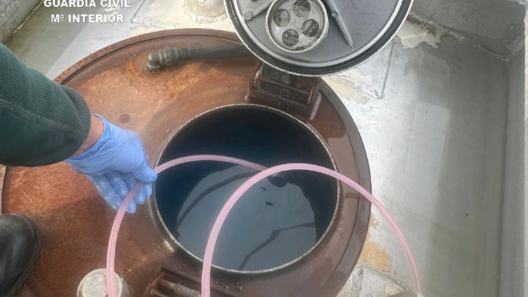 Tras establecer vigilancias discretas, los agentes se desplazan a la gasolinera para realizar una inspección y localizan en una finca anexa un camión cisterna dado de baja en la DGT, que estaba siendo utilizado como depósito. En su interior hallan 2.050 litros de gasóleo B y 300 litros de gasóleo C.