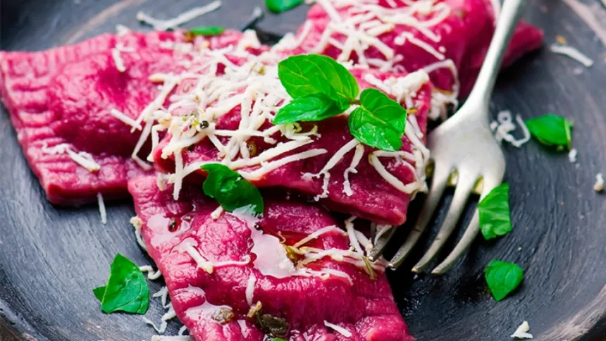 Una ensalada fresca y colorida: ravioli de ricotta y remolacha