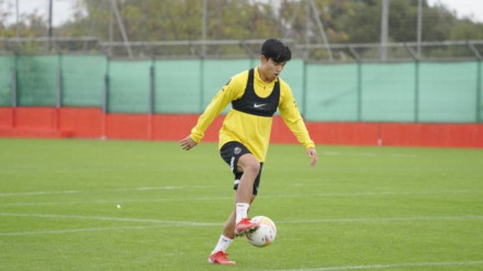 El atacante japonés completa su primer entrenamiento con el equipo tras lesionarse en el Bernabéu el pasado 22 de Septiembre