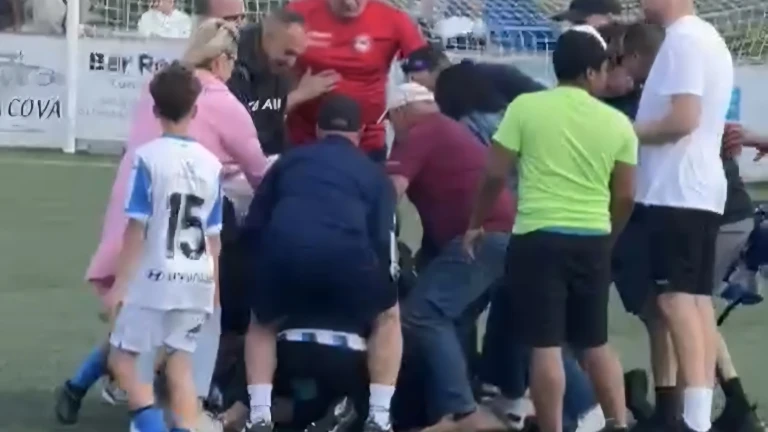 Tras empujar un técnico del equipo alemán a un chico del Atlético Baleares saltaba su familia al campo para defenderle. Después aparece un tumulto con bastantes adultos en el campo.