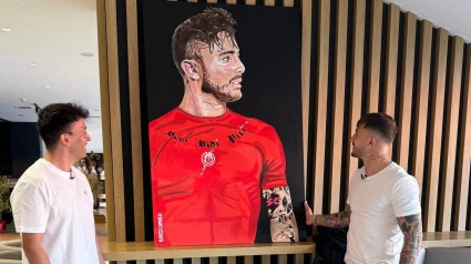 El artista pinta un cuadro del jugador del RCD Mallorca a gran tamaño y en el que están reflejados sus tatuajes. El futbolista, agradecido: "tener algo así para cuando me retire me hace ilusión"
