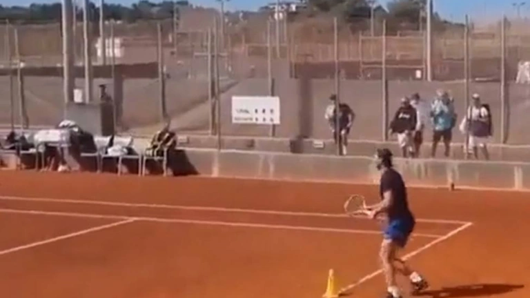 En un video subido por un aficionado al tenis en las redes, se ve a Nadal entrenando en Manacor en el fondo de la pista golpeando de derecha y pasando por detrás de un cono en la línea de fondo, con algunos aficionados siguiendo atentamente las evoluciones del manacorí.