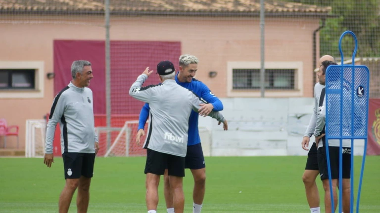 El capitán del Real Mallorca reaparece sobre la hierba de la Ciudad Deportiva Antonio Asensio manteniendo una animada charla con Javier Aguirre y el cuerpo técnico bermellón