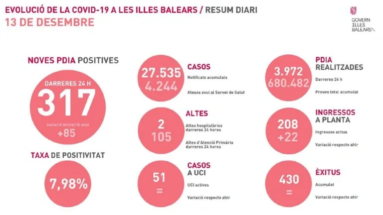 Sin embargo, este 13 de diciembre de 2020, hemos sumado más positivos: 317, aunque son menos los ingresos en planta y los casos en la UCI, 208 y 51 respectivamente. El total de muertes es de 430 y la tasa de positividad mayor, del 7,98%.