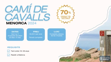 El Consell de Mallorca organiza por primera vez una ruta pel Camí de Cavalls en Menorca para jóvenes de entre 18 y 30 años residentes en Mallorca, con el objetivo de fomentar las actividades al aire libre. Esta actividad se llevará a cabo entre los días 3 y 7 de octubre de 2024 (cinco días y cuatro noches).