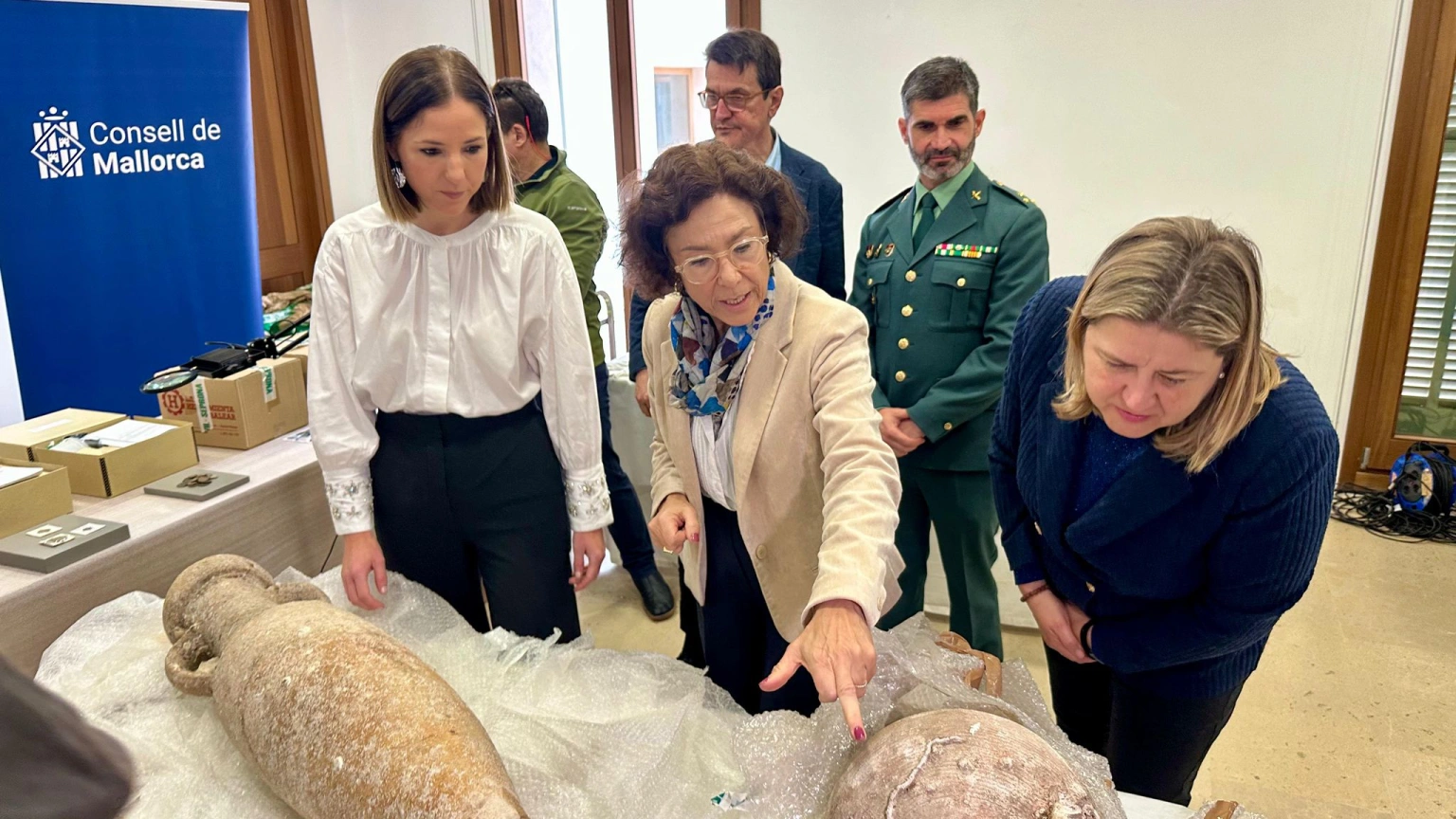 El Consell de Mallorca ha presentado en el Museo de Mallorca el material arqueológico interceptado en el aeropuerto de Palma hace un año. El hallazgo se produjo cuando una ciudadana alemana intentaba sacar de la isla un conjunto de piezas de gran valor patrimonial, que ahora han sido mostradas por primera vez por la consellera de Cultura y Patrimonio, Antònia Roca; el capitán jefe del Seprona en Baleares, Pedro Manuel García; y la directora del Museo de Mallorca, Maria Gràcia Salvà.
