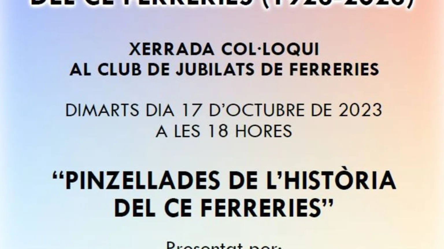 Con motivo de los diferentes actos previstos para celebrar el CENTENARIO del CE. Ferreries, les indicamos el previsto para la presente semana, (Martes 17-10-23 a las 18 h.), el cual se desarrollará en el local propio del Club de Jubilados de Ferreries, pero abierto a todo el público interesado en el mismo.