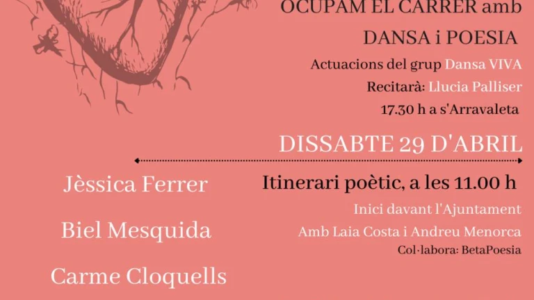 Por eso —y como novedad de la edición de este año—, el miércoles 26 de abril, durante el atardecer, se presentará la actividad 'OCUPAMOS LA CALLE CON DANZA Y POESÍA'. Habrá dos actuaciones, a cargo del grupo Dansa VIVA, y también se contará con la intervención de la poetisa menorquina Lucía Palliser. Además, está prevista otra actuación en el Centro de Día de la Residencia Geriátrica de Maó.