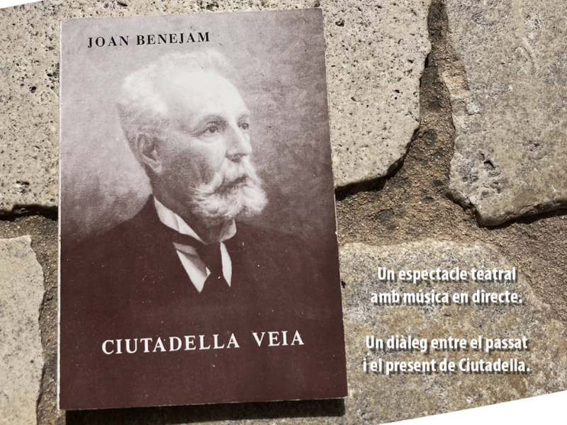 "Ciutadella veia" es un libro publicado en 1909, describe los cambios que sufrió la ciudad durante el siglo XIX a través de la mirada y las reflexiones del autor, de anécdotas y recuerdos. Una obra de gran valor literario especialmente por su legado histórico, pero también por invitar a reflexionar y tomar conciencia sobre qué modelo de ciudad queremos. Una reflexión que la hace muy vigente actualmente y es éste el motivo del espectáculo 'Ciutadella veia' que propone un recorrido por el texto, guionizado por Dolors Boatella y con la corrección de Bep Joan Casasnovas, interpretado por los actores Josep Mercadal y por Andreu Genestar (Joan Benejam) e ilustrado con la música de Cris Juanico (voz y guitarra), Moisès Pelegrí (percusión) y Lluís Gener (contrabajo) y una parte audiovisual creada con imágenes cedidas especialmente por los miembros del Fotoclub del Casino 17 de Enero. También han colaborado otros ciudadenses y ciudadelas como la actriz Sita Muñoz, el diseñador de espectáculos Pere Anglada o la directora del museo de Ciudadela Majo León, entre otros.