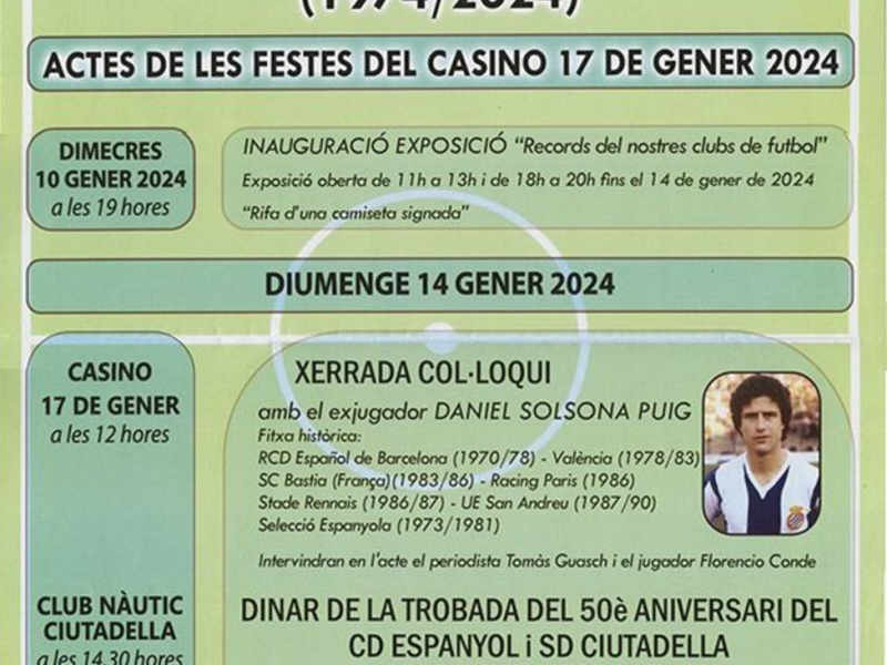 • Domingo 14 de enero: Actos centrales del ENCUENTRO DEL 50º ANIVERSARIO DEL CD ESPAÑOL Y SD CIUTADELLA (1974/2024), organizados por la Comisión de ex jugadores y la Asociación Histórica del Fútbol Menorquín y contando con la colaboración del Casino 17 de Enero.