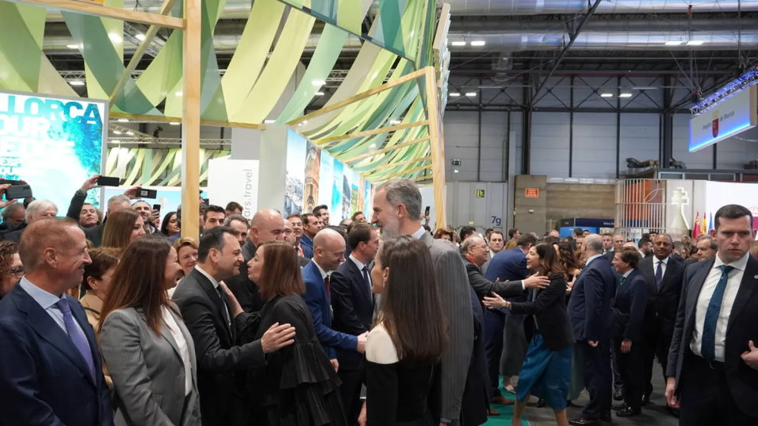 El presidente, Adolfo Vilafranca, saluda a los Reyes de España en su paso por el stand de Baleares y muestran interés por la cultura talayótica