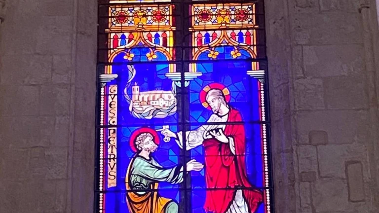El vitral representa la escena en la que Pedro recibe de Jesús la misión de ser piedra, fundamento de la iglesia, a la vez que acoge las claves de la administración de la misericordia y el perdón: “Tú eres Pedro; sobre esta piedra edificaré mi Iglesia (...). Te daré las llaves del Reino de los cielos”.