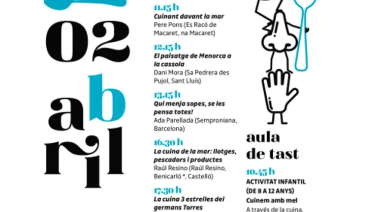 En cuanto al programa de actividades, en el Aula de Cata, los más curiosos podrán hacer degustaciones guiadas y asistir a los talleres y charlas para conocer con más detalle los productos de la isla. Entre otros, tendrán lugar una cata de “Bebidas y licores singulares de Menorca” con Grahame Pearce, Biniarbolla y Gin Cernícalo; una cata de quesos CRDO Queso-Maó Menorca, una cata de setas o la sesión “Miel y queso de Menorca: amigos por siempre jamás” que consistirá en una cata de mieles de Dolçamar y de seis quesos de diferentes fincas de la isla. En el mismo espacio, también tendrá lugar una degustación de pasteles sin gluten de la Pastelería Lluís Febrer.