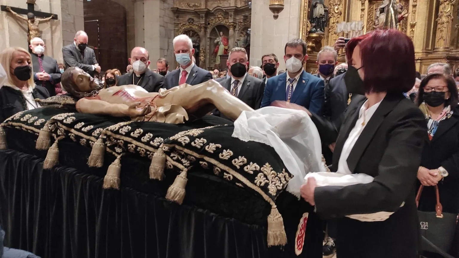 Centenares de logroñeses cumplen con la Limpieza del Cristo del Sepulcro ya preparado para el Viernes Santo