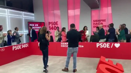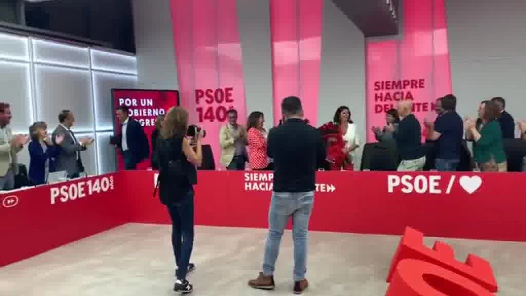 Pedro Sánchez entrega un ramo de rosas rojas a Concha Andreu por su elección como presidenta de La Rioja