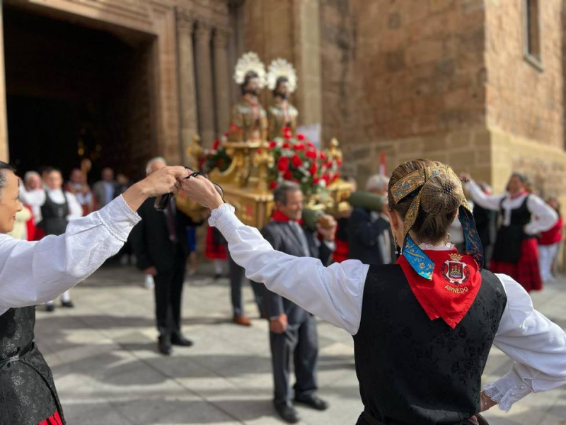 En tiempos de la peste de los siglos XVI y XVII, esta localidad se encomendó a estos santos mártires para sobrevivir y, tras lograrlo, en el siglo XVIII erigió una iglesia en su honor. En 1769 se concedió a Arnedo celebrar una feria y mercado para conmemorar a San Cosme y San Damián y en sus primeros años ya se produjeron los primeros intentos de losa vecinos de Andosilla de "robar" las imágenes de los santos reivindicando para ellos esta celebración. Este intento de robo, a modo lúdico, se mantiene en la tradición de Arnedo y Andosilla, aunque en ocasiones se han sumado vecinos de otros municipios, unida a la presencia desde la madrugada del 27 de septiembre de "auroros" llegados, en parte, de Navarra, que cantan alabanzas a Dios por el amanecer de este día. Tras la procesión de los auroros, ha llegado el momento del desafío navarro, con "mozos" de Andosilla que han reclamado en tres ocasiones, con canciones, las tallas de San Cosme y San Damián durante su procesión por el municipio. Pero ni los jóvenes de Arnedo que las portaban, ni los centenares de vecinos congregados en las calles han permitido a los navarros salirse con la suya y les han despedido con el tradicional "¡autruaño será!". Porque ya no será hasta el 27 de septiembre de 2023 cuando los navarros vuelvan a reclamar a San Cosme y San Damián y, salvo sorpresa, los arnedados volverán a impedir que sus santos salgan de la ciudad.