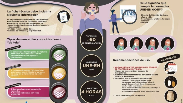 Lo primero que hay que tener en cuenta para adquirir una mascarilla ‘de tela’ es analizar la ficha técnica del producto. Esta debe especificar: que cumple la normativa UNE-EN 0065 (o la homóloga europea -CWA17553-), es decir, que tiene una filtración mayor o igual a 90 de dentro afuera, que está homologada, testada y fabricada según estándar. Además, en la ficha de producto se deben encontrar las recomendaciones de lavado del fabricante, el número de lavados que soporta -las enfermeras recomiendan no adquirir aquellas que aguanten menos de cinco lavados-, composición, periodo y tiempo recomendado de uso -nunca mayor a cuatro horas seguidas o intermitentes-. También destacan la importancia de que en ella se especifique la eficacia de filtración y respirabilidad.