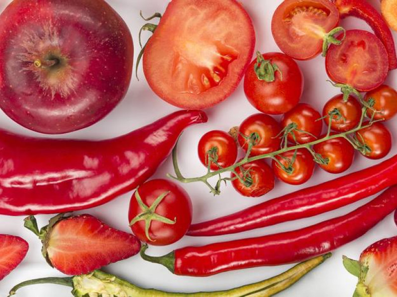 El color rojo del tomate, sandía o fresas, se debe a un pigmento llamado “Licopeno”. Es un carotenoide, es decir, una sustancia química natural responsable del color rojo de las frutas y verduras. El licopeno es el mejor antioxidante contra radicales libres, asociado a pectina y vitaminas que ayudan a mantener niveles normales de colesterol. El principal alimento rico en licopeno es el tomate, pero también se puede encontrar en otros alimentos rojos como la sandía, el pomelo, las fresas. Además, los alimentos de color rojo son ricos en Vitamina C, A, potasio y antioxidantes.