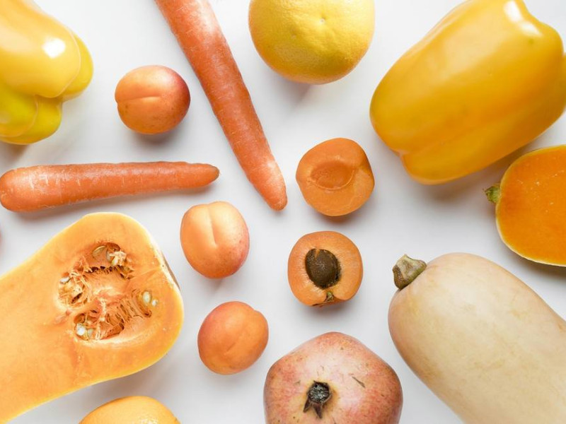 Las frutas y hortalizas con este color son antioxidantes, pero además destacan por su capacidad para ayudar a proteger el sistema inmune, la piel y la vista. Estos beneficios los aportan los “Carotenoides” como el betacaroteno, que dan el color anaranjado tan típico de zanahorias, naranjas, calabazas o albaricoques, entre otros. Los carotenoides son antioxidantes de gran alcance y además son precursores de la vitamina A. Estas frutas y verduras son fuente de vitamina C y A, que combaten el envejecimiento celular gracias a su acción sobre los radicales libres. Las frutas y verduras de color amarillo además son ricas en potasio, como el plátano, y en luteína como el maíz.