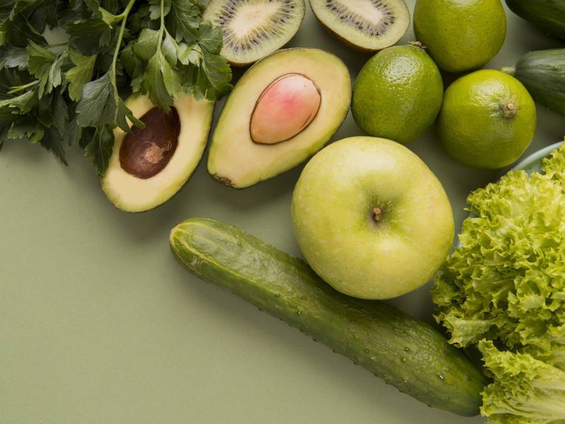 El color verde de las frutas y verduras como las espinacas, brécol, kiwi, uvas, es aportado por la clorofila, el pigmento más extendido del reino vegetal, es una sustancia que en alimentos sin cocinar puede ayudar a prevenir algunas enfermedades. Es un color que se asocia con alimentos sanos, y la verdad es que lo son. Cuanto más verde es un vegetal, más rico en betacarotenos y vitamina C, también poseen antioxidantes que protegen frente al daño oxidativo de las células, sus propiedades son principalmente depurativas, además, son alimentos ricos en fibras, vitaminas y minerales) y combaten el envejecimiento celular gracias a su acción sobre los radicales libres.