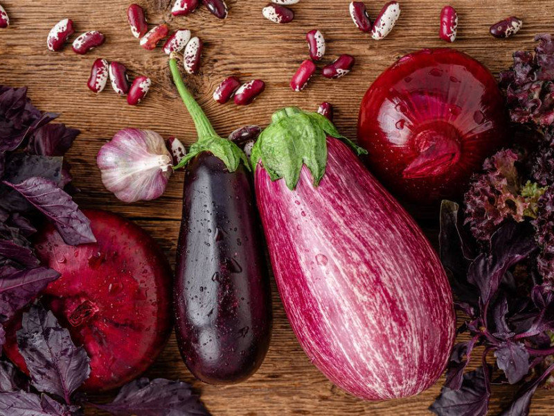 Variety of purple veggies and basil on wooden table. Flat lay, overhead