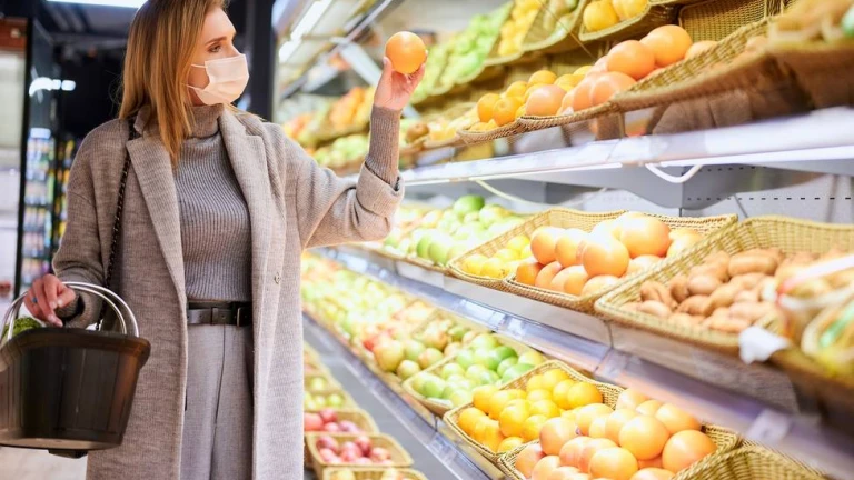 Woman in medical masks is shopping in grocery store during virus pandemic