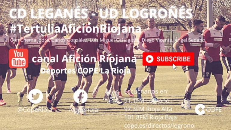 CD Leganés - UD Logroñés: Domingo, 16 de mayo 23:30 horas. La tertulia en el canal Youtube 'Afición Riojana'. Con Chema Jodra, Carlos González, Luis Miguel Ochagavia, Diego Vicente y Ángel Sedano.