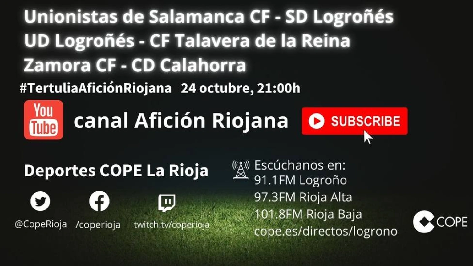 Afición Riojana' es el canal de Youtube de Deportes COPE Rioja. Creado para todos los aficionados y aficionadas al fútbol riojano. Será el primer análisis al término de cada jornada con animados y divertidos debates y tertulias.