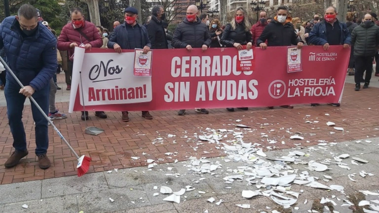 Durante este acto, en el que han participado distintos representantes de los partidos PP y Ciudadanos (Cs) de La Rioja, diversas personas han roto platos contra el suelo en señal de protesta, mientras se sostenía una gran pancarta en la que se podía leer “nos arruinan, cerrados sin ayudas”.