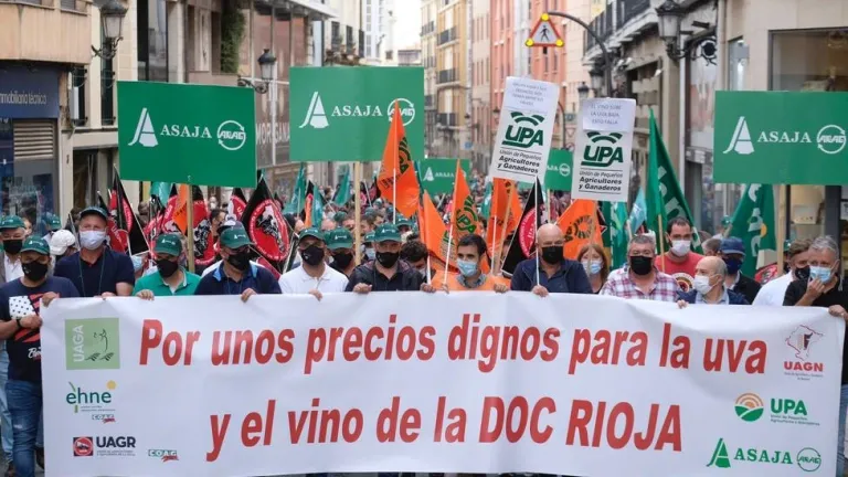 Algo más de un millar de viticultores de la Denomninación de Origen Calificada (DOC) Rioja se han manifestado por el centro de Logroño para exigir contratos y precios dignos para la uva y el vino. Estaban convocados por las seis organizaciones agrarias representadas en el Consejo Regulador de la DOC: ARAG-ASAJA, UAGR-COAG, UPA Rioja, UAGN, UAGA y EHNE-COAG. Un hito que, según han dicho, se repetirá si las bodegas no suben el precio de la uva por encima de los costes de producción.