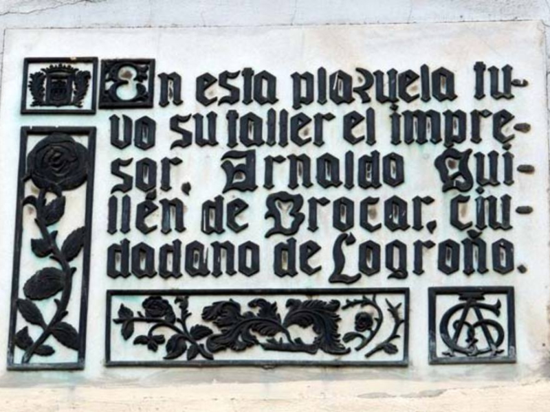 Tras abandonar Francia, Guillén de Brocar se instaló, inicialmente, en Pamplona hacia 1.490, y alí trabajó durante doce años, hasta 1501. De este periodo se conocen 28 impresiones, entre libros y hojas sueltas, de los cuales 25 son incunables. En 1501, se trasladó a Logroño, donde imprimió las Elegantiae de Agostino Dati (1502), el Sacramental de Clemente Sánchez de Vercial (1504) o las Introductiones latinae de Nebrija, que presentó al Cardenal Cisneros. En 1511, se mudó a Alcalá de Henares requerido por Cisneros, aunque no cerró su taller de Logroño hasta 1514.