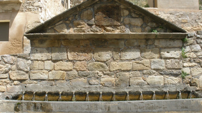 La fuente que da nombre a este pequeño pero bonito pueblo de la comarca de Arnedo se encuentra junto a un muro de mampostería, donde se encuentran los dieciséis caños metálicos de los que mana el agua a un desagüe abrevadero.