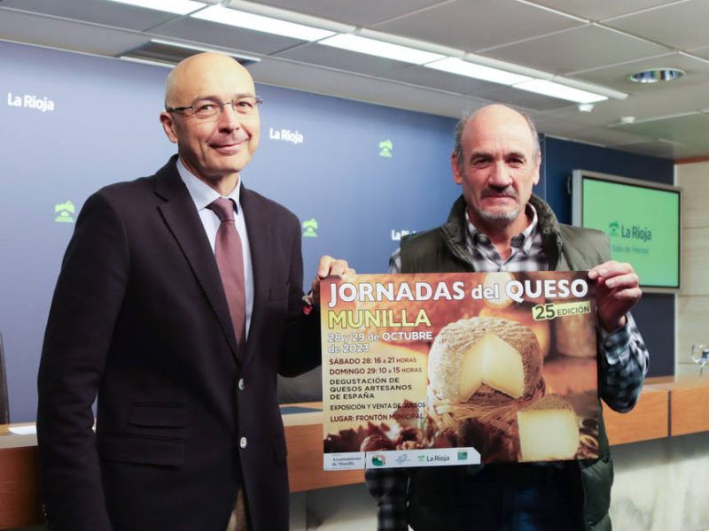 El director general de Desarrollo Rural, David Martín, junto al alcalde de Munilla, Claudio García, ha presentado hoy, día 25, la XXV edición de las Jornadas del Queso de Munilla que acercará al público el sector agroalimentario, sus tradiciones y permitirá degustar unos magníficos productos artesanos de proximidad, como el queso.