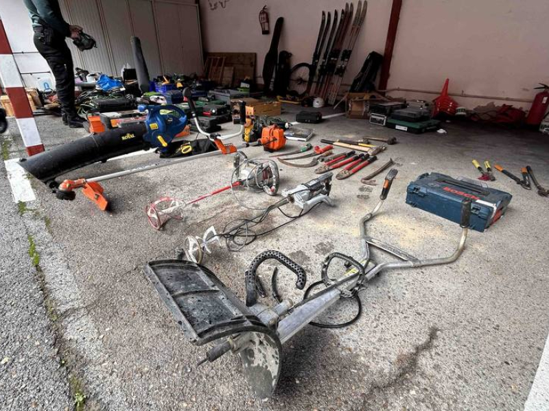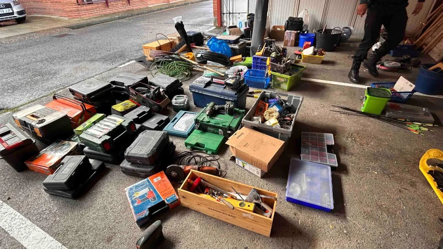 Con la pertinente autorización se procedió al registro del garaje hallado en su interior 120 efectos de ilícita procedencia: lijadoras, amoladoras, sopladoras, taladros, compresores, destornilladores, desbrozadora, mezcladores de cemento, multicortadoras, hornillos, corta césped, rotaflex, sierras de calar, mazas, esquís, plas de esquiar, ruedas, cascos de bici, gafas de realidad aumentada, cubertería y bandejas de plata.