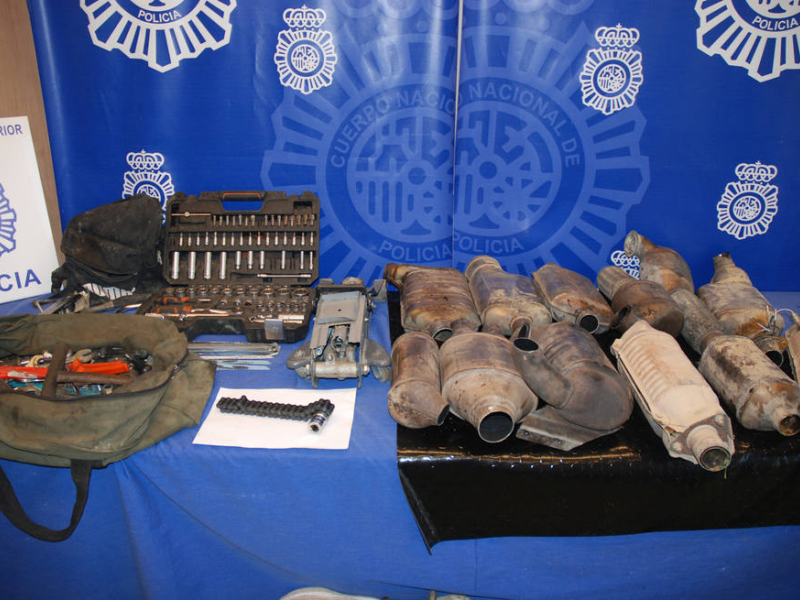 En el momento de la detención, se recuperaron 12 de estas piezas, junto con diversas herramientas necesarias para poder desmontar los catalizadores de los vehículos, entre ellas, hojas de sierra para metal, dos gatos hidráulicos y una herramienta artesanal especialmente fabricada para la fractura de los tubos.