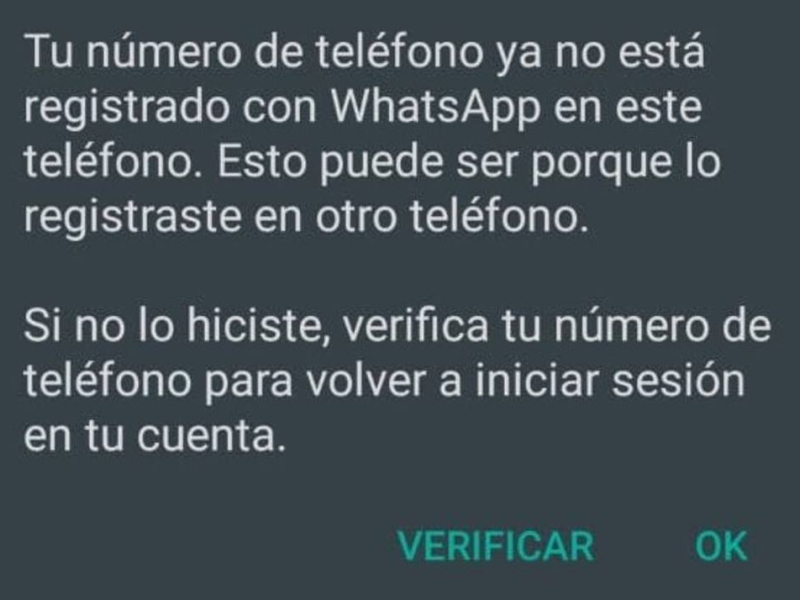 El problema es que si hacemos caso a la petición de envío del código recibido por SMS y se lo enviamos a quien creemos que es nuestro contacto, le estaremos dando la oportunidad de controlar nuestra cuenta de WhatsApp y suplantar nuestra identidad en este servicio de mensajería, y cuando intentemos acceder a nuestra cuenta se nos mostrará el siguiente aviso: