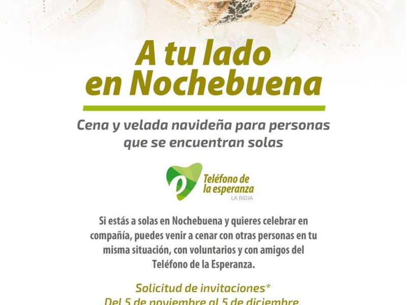 Para muchas de estas personas es muy importante sentirse acompañados en Nochebuena y compartir ese momento con otros. Por eso, el Teléfono de la Esperanza de la Rioja, dentro del programa “A tu lado”, organiza este encuentro, un espacio en el que compartir la cena de Nochebuena con otras personas en la misma situación, disfrutar de la velada en compañía y, quién sabe, tal vez iniciar nuevas amistades.