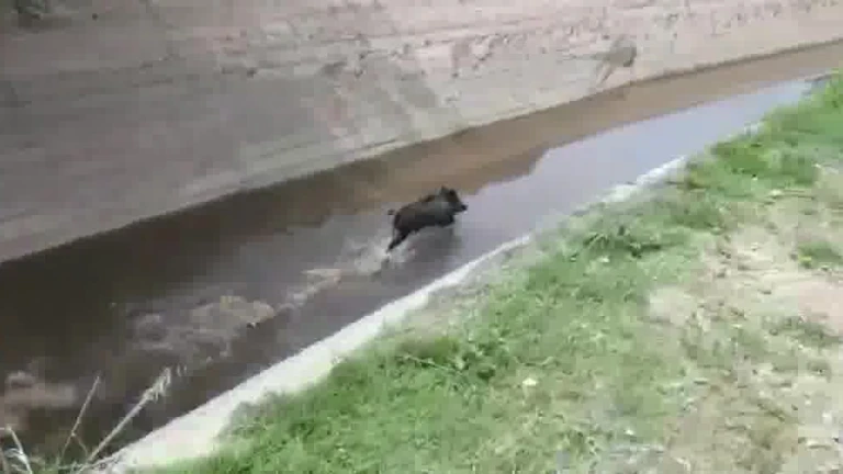 Un veloz jabalí emprende la huída al verse sorprendido en el canal de Lodosa