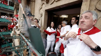 Aritz Ibáñez Lusarreta, Ángel Arana Seguín e Itxaso Martínez de la Pera Barrachina, representantes del grupo Duguna Iruñeko Dantzariak / Dantzaris de Pamplona, que este año cumple su 75º aniversario, han sido los encargados de prender la mecha del cohete que ha anunciado el inicio de los Sanfermines.