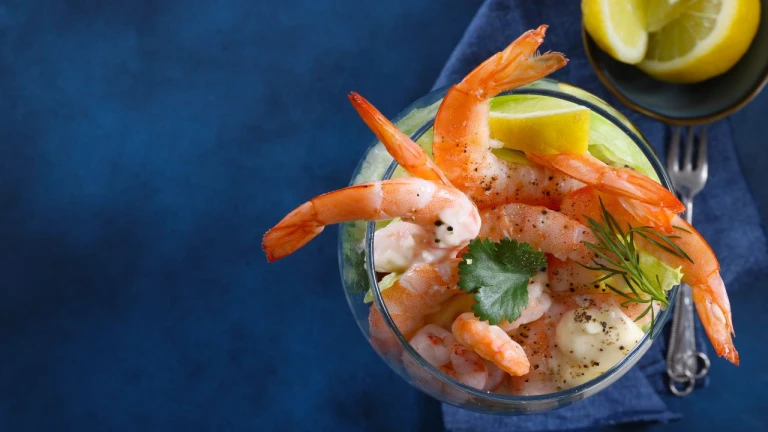 Cóctel de aguacate con gambas, yogur y salsa rosa