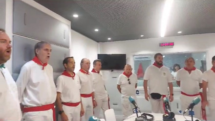 Javier Belloso y Antonio Álvarez analizan el encierro de hoy acompañados por el corredor Mikel Izco